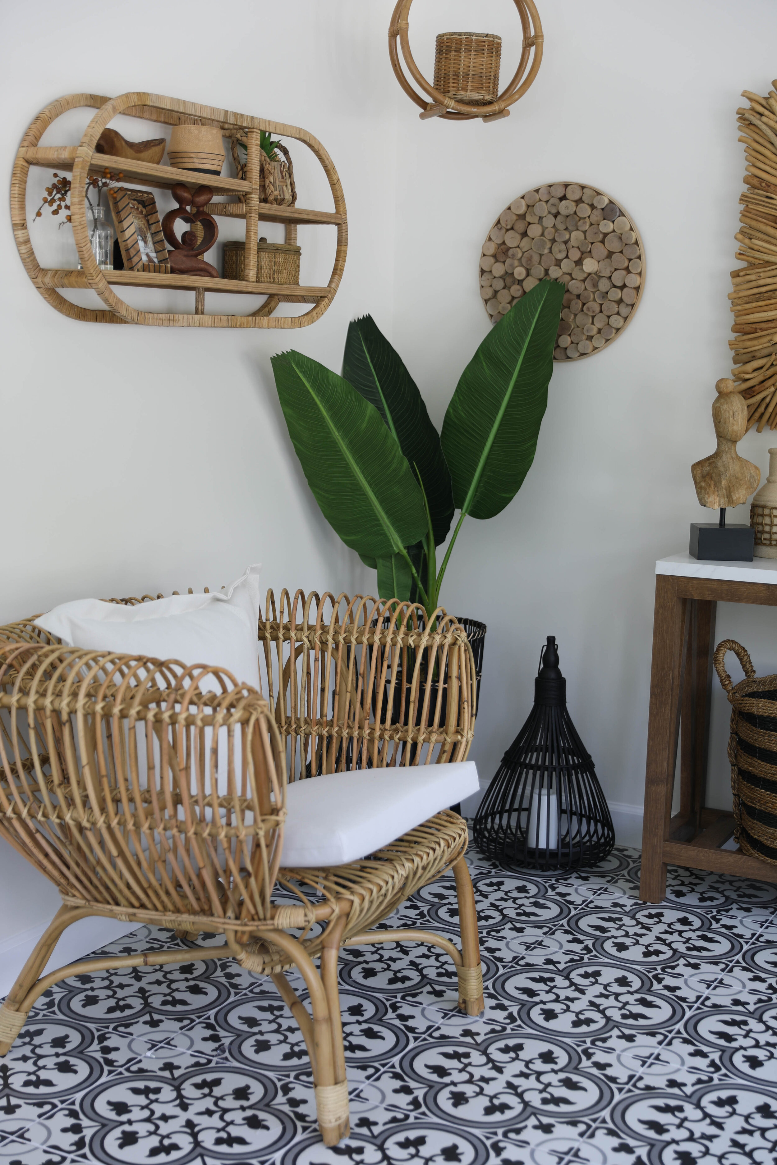 What I envisioned in my head was a relaxing, Tulum style vibe, and I think I nailed it. I wanted a room that looked inviting and a space that the whole family could chill in. A lot of you ask how I think of the decorating ideas in my head, and most of the time, it's an element that starts it's off. For this space, the tile was what began the room idea. Once I had the tile, I knew I wanted neutral colors to tie it all together. I also knew that I would be changing the dining room to black and white decor because when we eventually renovate the kitchen, the colors would be black and white. Once every space is complete, it's going to look amazing, but for now, I will enjoy this area for the rest of the summer.